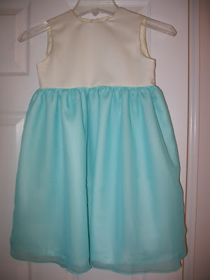 Here’s the flower girl dress for the previously mentioned aborted wedding. The pattern consists of design elements (A-I) that can be combined for whatever look you’re going for. I was asked to use A (bodice) and B (full skirt) and add a sheer overlay to the skirt portion. The dress itself is ivory bridal fabric and the overlay is a tiffany blue bridal sheer. The bodice is lined with a matching ivory bridal satin. I inserted an invisible zipper in the back and I finished the edges of the sheer overlay on my serger with a rolled edge finish. The dress went together very quickly and easily. The instructions are straightforward with no snags. Once I finished all the edges of the overlay, I attached it to the bodice along with the skirt piece all in one motion. I used my invisible zipper foot to sew in the zipper.
