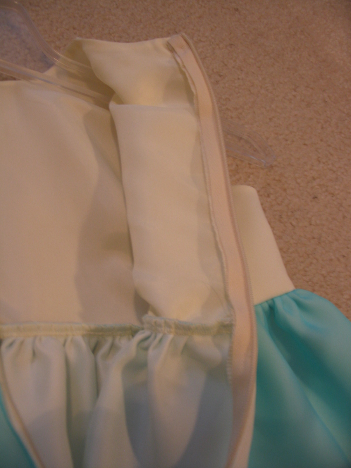 Here’s the flower girl dress for the previously mentioned aborted wedding. The pattern consists of design elements (A-I) that can be combined for whatever look you’re going for. I was asked to use A (bodice) and B (full skirt) and add a sheer overlay to the skirt portion. The dress itself is ivory bridal fabric and the overlay is a tiffany blue bridal sheer. The bodice is lined with a matching ivory bridal satin. I inserted an invisible zipper in the back and I finished the edges of the sheer overlay on my serger with a rolled edge finish. The dress went together very quickly and easily. The instructions are straightforward with no snags. Once I finished all the edges of the overlay, I attached it to the bodice along with the skirt piece all in one motion. I used my invisible zipper foot to sew in the zipper.NewLook 6860