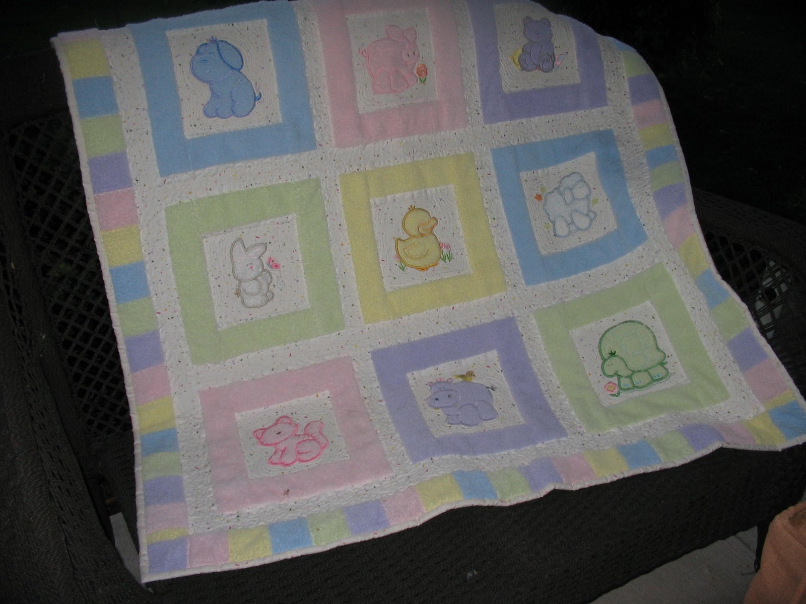 This was a kit purchased from a magazine a couple of years ago. It uses machine embroidery applique for the quilt squares and Minkee fabric for the pastel colored borders. The light colored background is a subtle print of 100% cotton.