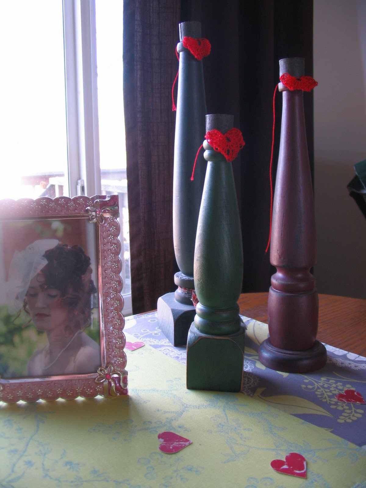 I crocheted these little mini hearts and didn’t know what to do with them, so they became bowties on my antique candle holders!