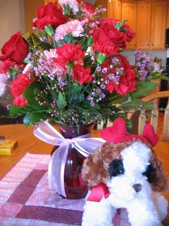 Here are some sweet gifts from my sweet DH who happens to be out of town on this sweet day. Whatta guy! I Love you DH. The cute little stuffed dog brings to mind a said Basset who lives with us. Same coloring and the heart horns are quite befitting.