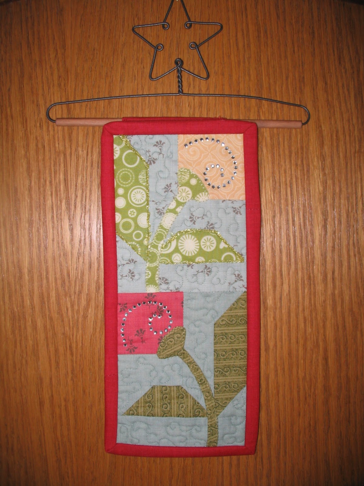 The pattern is from Nancy Halvorsen’s book, Garden Song. I followed the pattern instructions exactly, except I omitted the side border strips and used the red fabric as binding instead. Why did I do this, you ask? Because I wasn’t paying attention and I quilted the little block together before I added the border strips. Oops! Oh well, it still turned out cute and I have it hanging in my living room as a reminder that Spring really will arrive in a few weeks (or months).