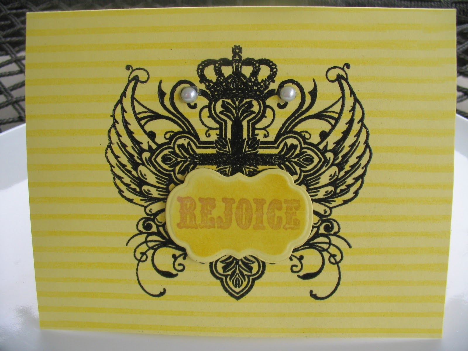 The card itself is made from Gina K designs pure luxury cardstock (lemon drop) which I cut to 5 1/2″ x 8 1/2″ and scored with my Scor Pal at 4 1/4″. Then I stamped and embossed the fabulous design from Gina K designs (Christ has Risen by Nina Brackett) in black embossing. Then I stamped the background stripes (Hero Arts Repositionable Rubber Stamp) with Vivid ink (lemon ice). The greeting is from the same Christ is Risen stamp set from Gina K designs and I cut the label (labels #14 by Spellbinders) using my Cricut. The pearl embellishments are from Close to my Heart.