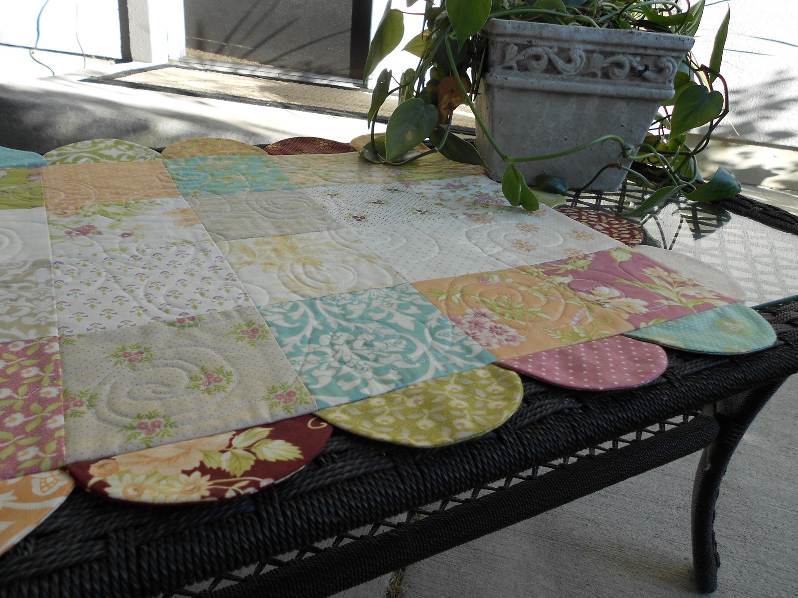 The colors are perfect for my mother’s home. She likes soft, pastels and this fits the bill. This is a great pattern by Sandy Gervais – it sews together quickly and it is fairly inexpensive. It only requires one charm pack, and a small amount of batting and backing fabric. I have a number of these table runners around my home. This post and this post (on the back of the chair) are two examples of a couple variations that I made of the pattern.