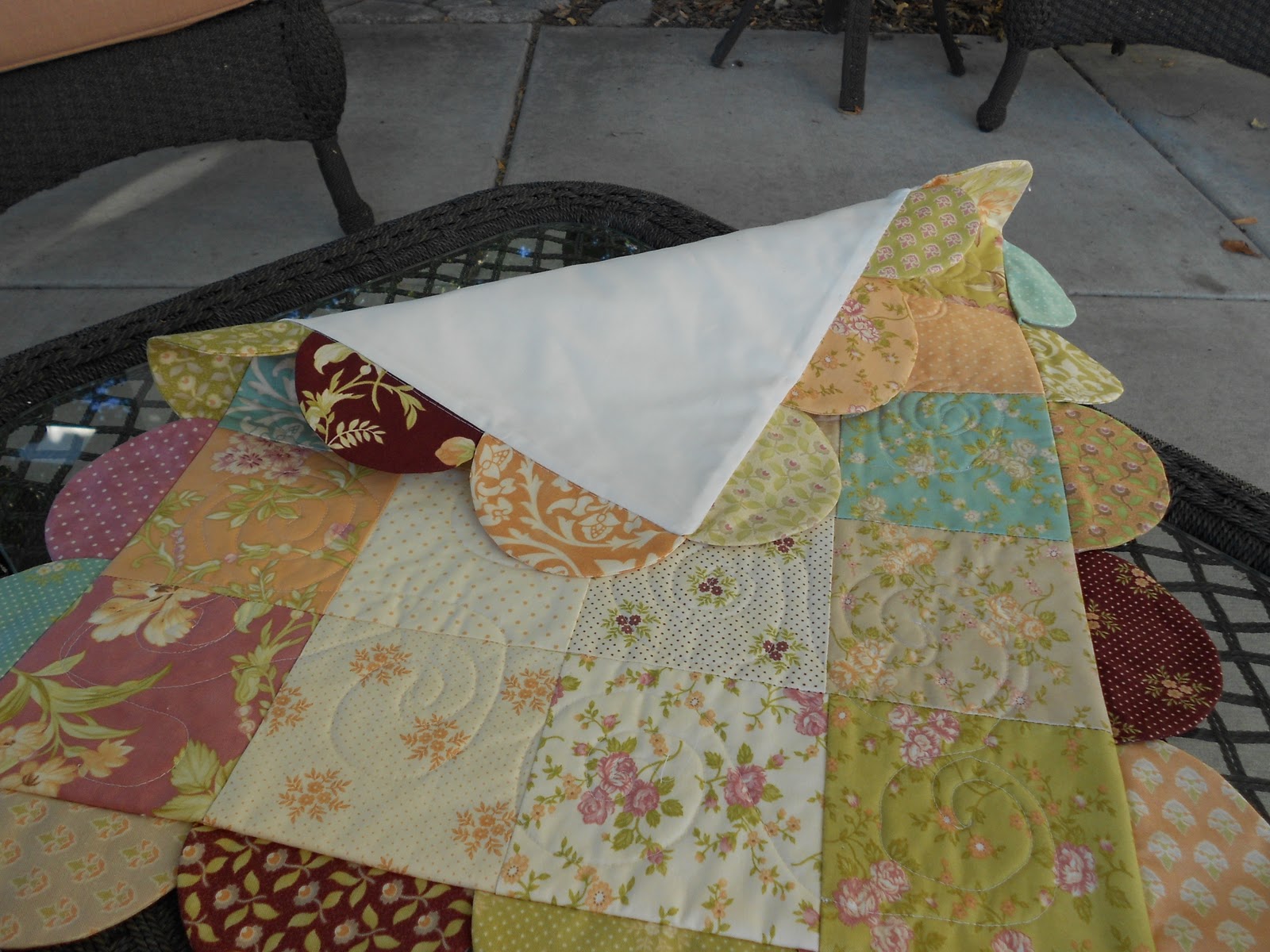 I know my mother will not turn this over to use the back side, so I used a vanilla colored kona cotton for a simple backing. Here’s a picture of the back, plain and simple.