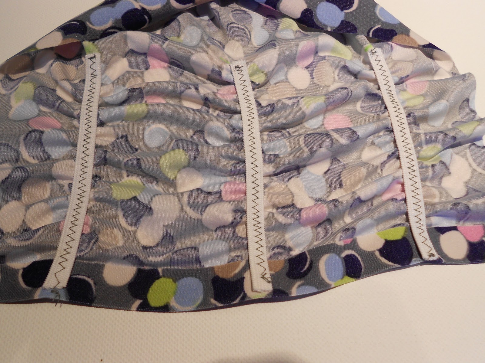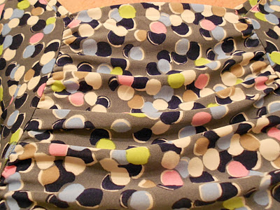 It is difficult to see because of the busyness of the print, but the front ruching detail is quite flattering for my small bust. Here’s a close up (under poor indoor lighting).