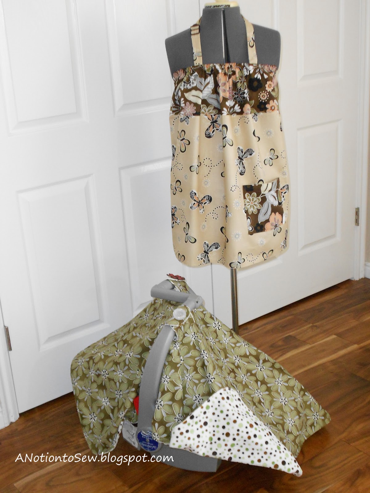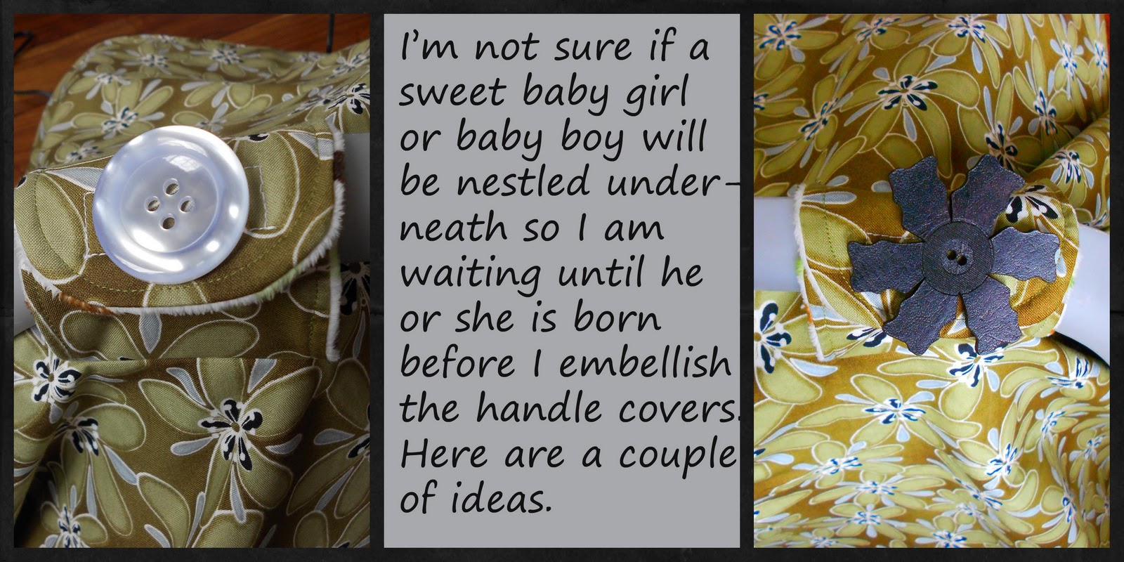 Let’s start with the car seat cover. I used this tutorial. But be warned, unless you know the type of handles your intended car seat has, don’t sew the handle covers on yet. Some car seats have a straight across handle bar, others have a zig zag. I sewed the cover for a straight across handle bar only to find out that my daughter’s car seat has the zig zag handles. Who knew?! As you can see, the outer fabric is mostly green with some tone on tone flowers.