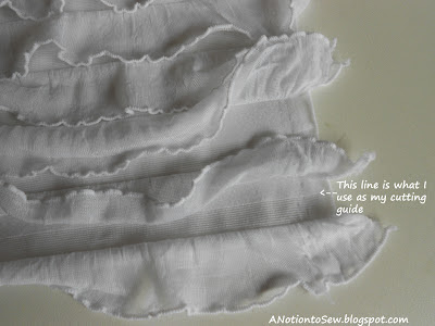 1. First, lift up those ruffles and have a peak. You will see that there is enough ‘flat’ fabric between each ruffle to allow you to cut off as many rows of ruffles as you would like. For this dress, I chose to just use one row of ruffles.
