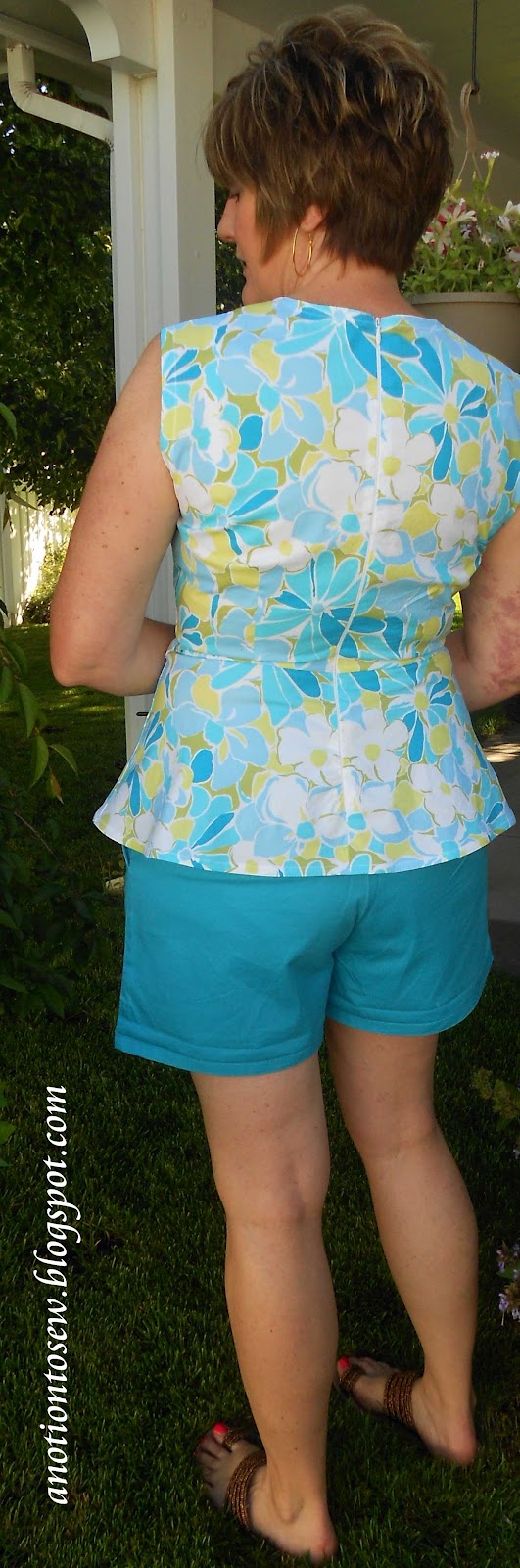 IMHO, peplum tops are very flattering, so I had to take this Vogue pattern for a test run.  The last peplum top I made was from a Burda WOF pattern and I wear it quite often.  I made it before I started blogging, but it was my first review on Pattern Review if you are interested.  This Vogue top will get just as much wear as the Burda peplum.  I really like the match up of this stretch sateen fabric from my stash along with this pattern.  The fit is close-fitting  and you would not want this to have a lot of wearing ease as it would alter the style lines of the top.  Therefore, the small amount of stretch in this sateen fabric works beautifully.