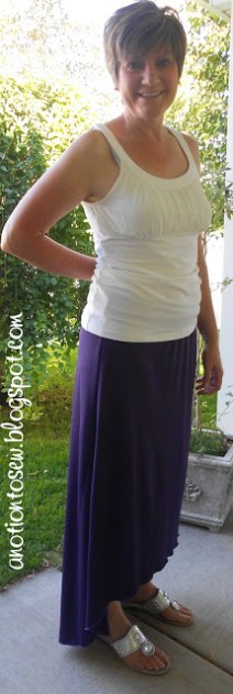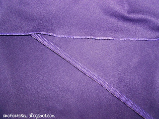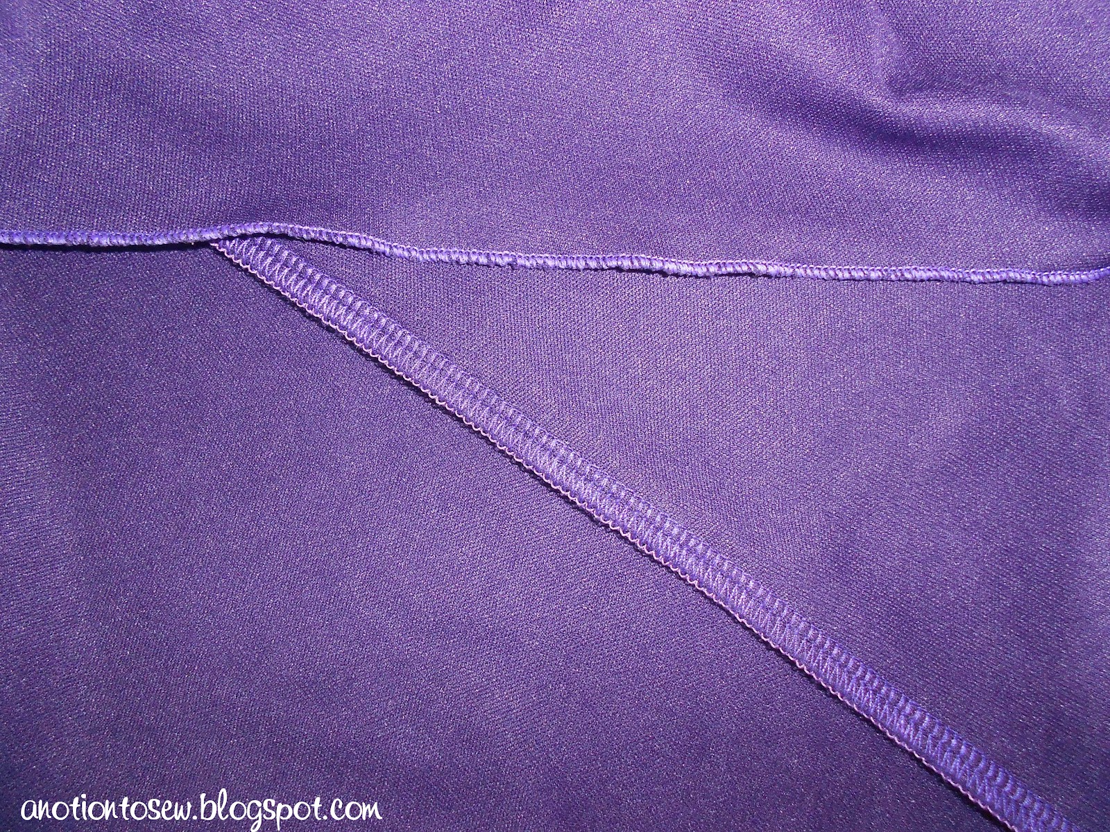 I’ve had this knit fabric in my stash for several months.  I think I picked it up at Joann’s for 50% off during one of their spring sales.  It is a very lightweight one-way stretch nylon/lycra knit.  I adore the deep purple color.  Since I used knit fabric, I didn’t do anything special to the seam finishes.  I simply used my serger to finish them.  If you choose to make this same version with the shaped front hemline as I did, be aware that the inside of the back will be visible.  I recommend a fabric such as this where the wrong side is not distinguishable from the right side and I recommend that you plan to finish the seams in some way so you don’t have raw edges showing.