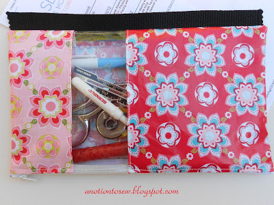 I didn’t have the time or desire to shop for supplies so this tutorial was the perfect answer to my search for the perfect little pouch. Isn’t it dang cute!!! I only made a couple small changes to the original pattern. I used laminate fabric (by Riley Blake) and instead of the fabric three ring binder tab called for in the pattern, I simply used a piece of canvas strapping that I found in my stash. No, I do not have the grommets on it yet, because I did not have any on hand. I will purchase those later. As for now, I will just be carrying it in my purse anyway.