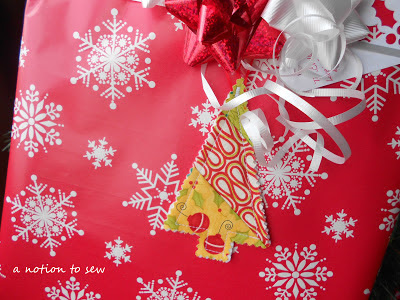 Here’s a great way to use up those Christmas print scraps. It is a free pattern download from the Baby Lock Web site. This is such a quick and easy scrappy Christmas tree. I sewed up two of these in a matter of minutes, and I plan to sew at least eight more this afternoon. I am using them on Christmas packages such as this: