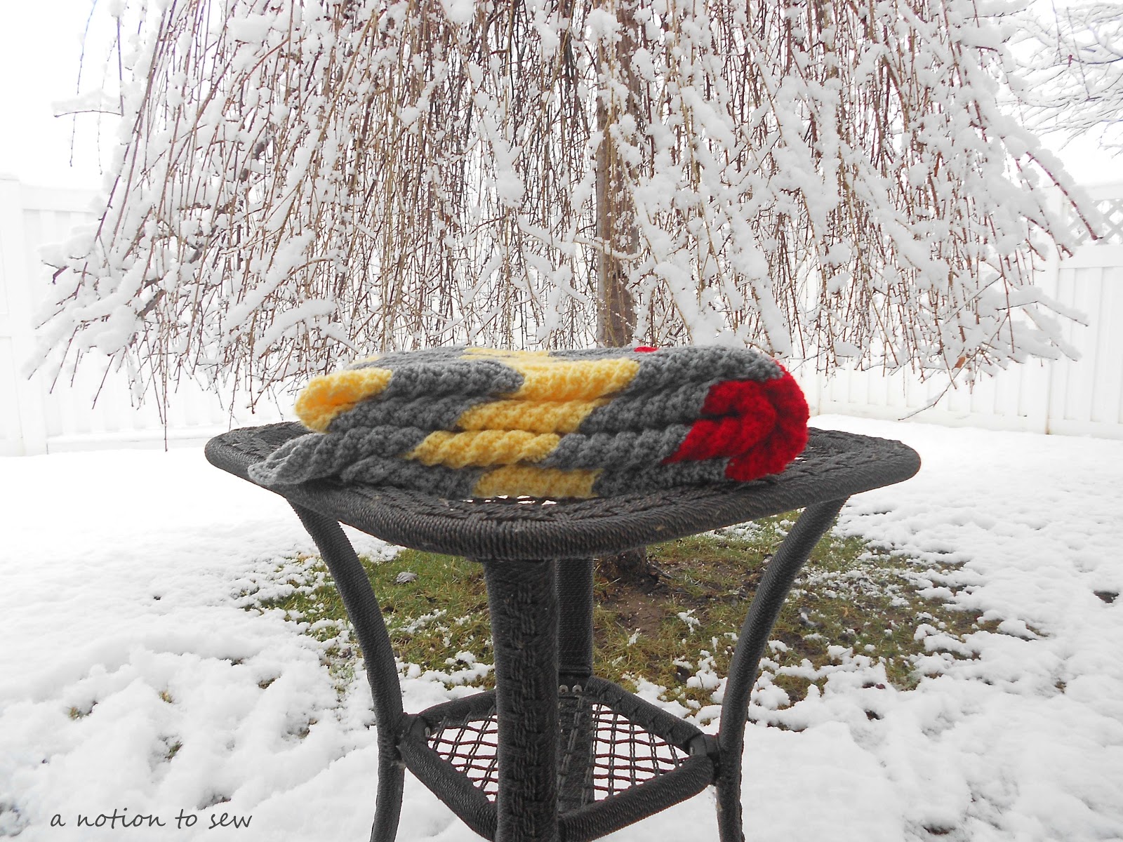 The pattern is a free one from here. I used a size I crochet hook, and the following Red Heart brand worsted weight yarn colors: