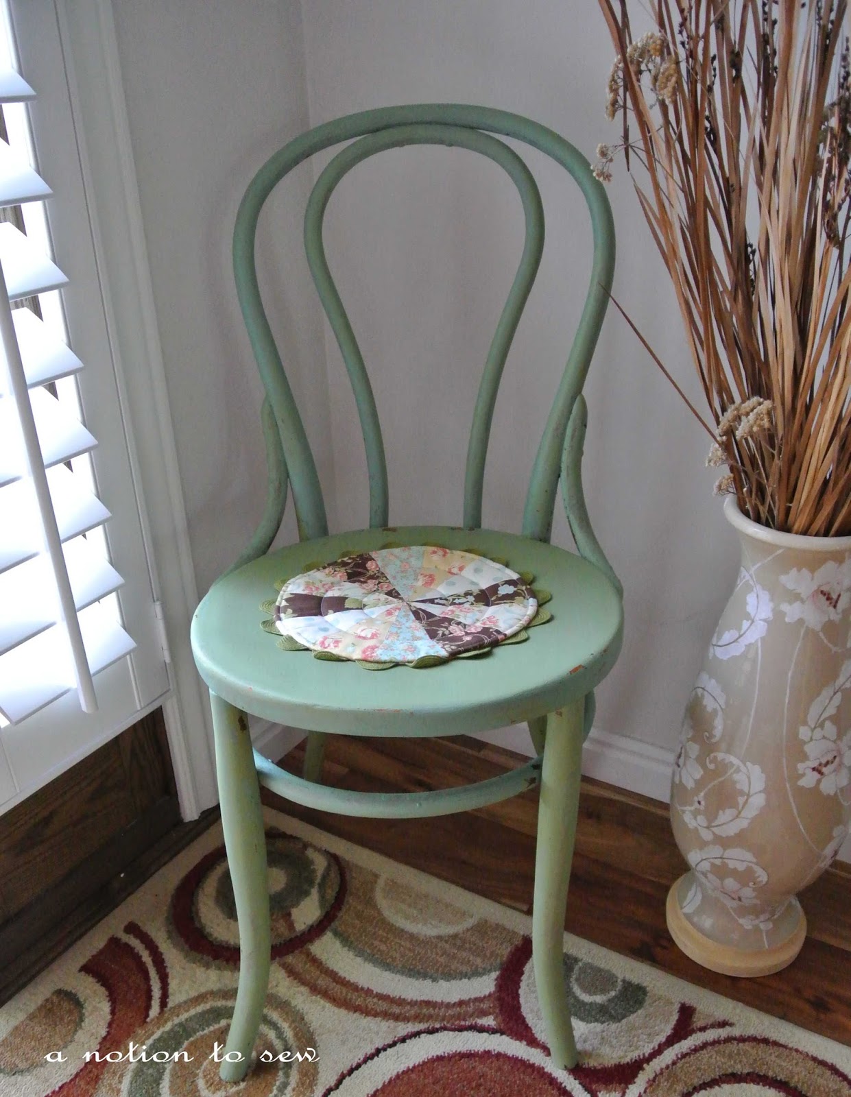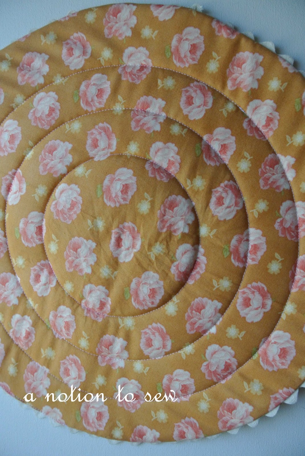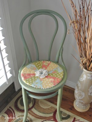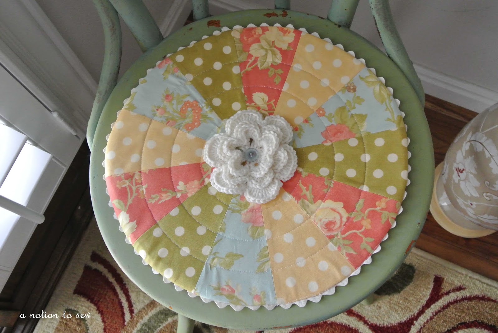 I love trivets! But my intended use for this one is not for hot pots, but rather to add a decorative touch to this vintage chair that sits in the corner of my entryway. The pattern is from the Sew4Home blog. I used fabrics and supplies I already had on hand. The fabric is leftover from this bed runner. The over sized green ric rac was purchased a couple of years ago from one of my local quilt stores. As you can see in the photo below, the trivet is a bit sparse on this chair seat, so I decided to alter the pattern a bit and make it slightly larger.