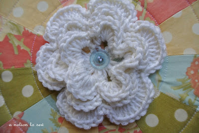 I added a crochet flower to the center of this one because in altering the pattern, I messed up the center where all the points are supposed to come together nicely (as they do on the original version when following the pattern as written).