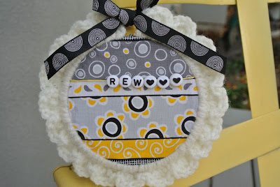 Some shell stitch crochet around a wooden embroidery hoop adds a sweet frame to the hooped fabric.