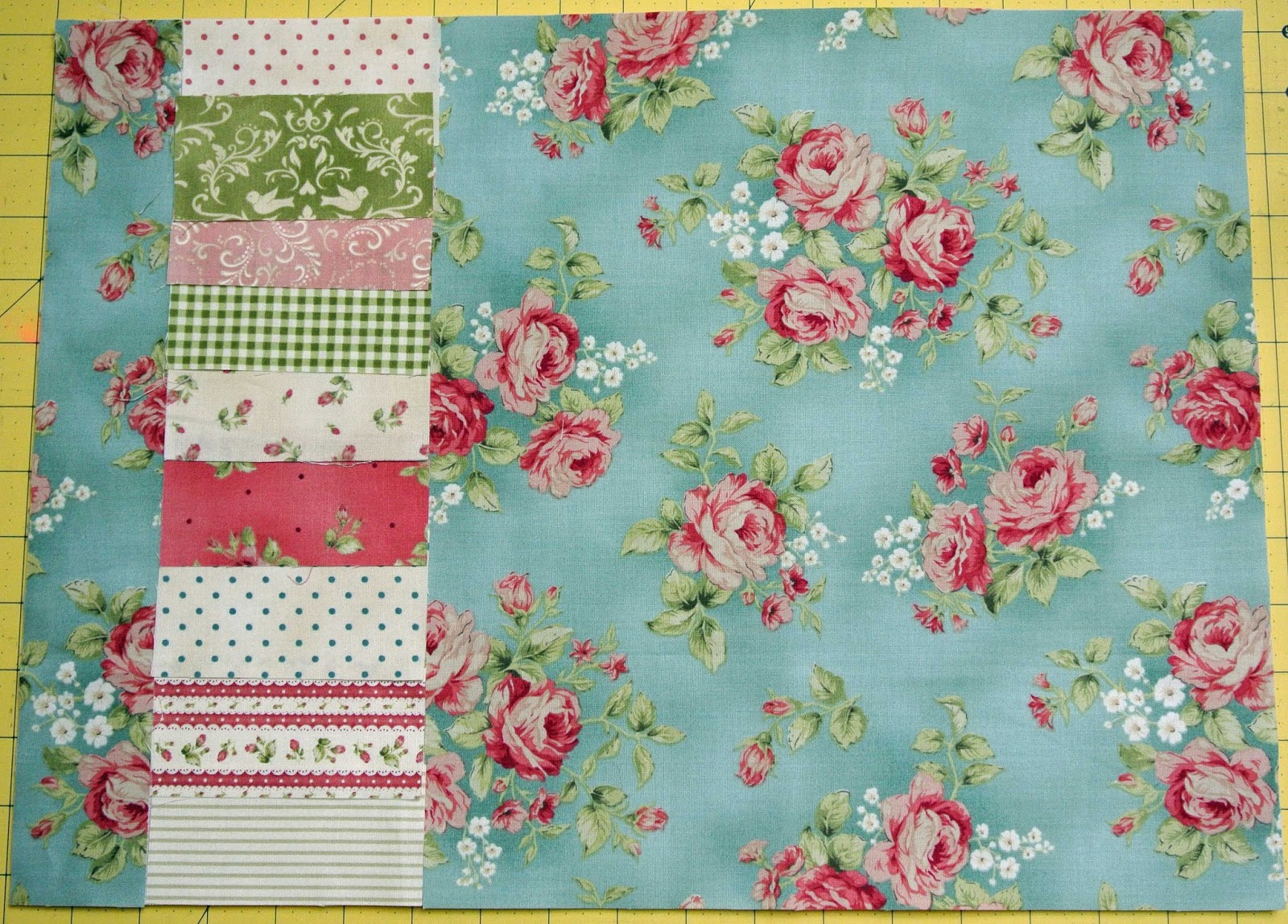 Miscellaneous coordinating fabric scraps for 2″ x 4″ pieced strips