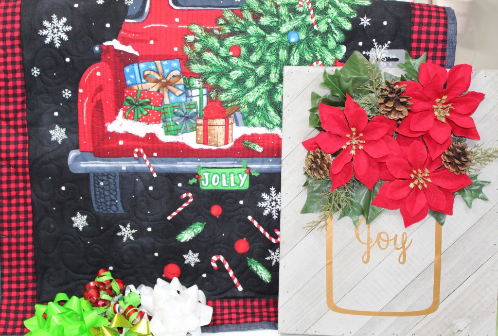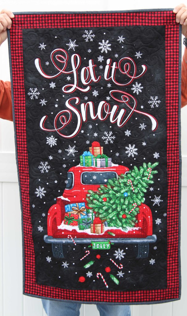 I still consider myself a beginning quilter, so please don’t judge me too harshly. 😊 I stitched an all over swirl on the background, I outlined the truck then added vertical straight line quilting to the body of the truck, and I added jagged line quilting to the tree to mimic pine needles. It was a great learning process.