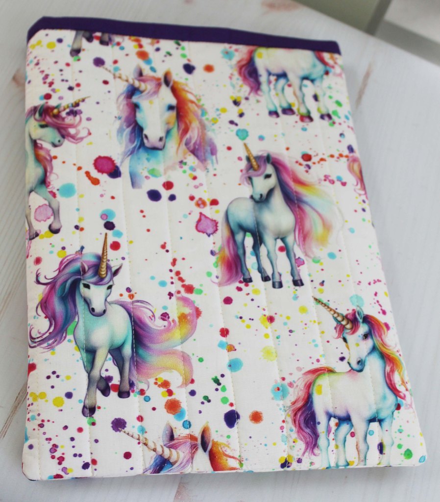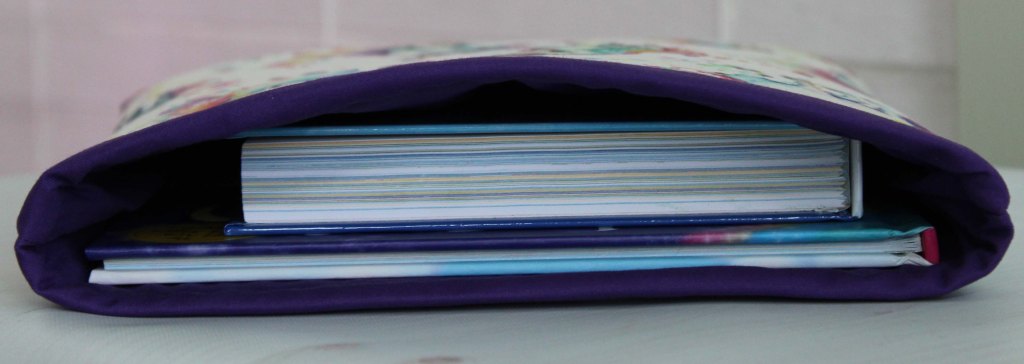 I’ve been noticing book sleeves all over social media lately. My granddaughter is all about unicorns right now. So I stitched up a couple book sleeves for her new books. The cotton poplin fabric is from Spoonflower. It was pretty much a perfect weight fabric for this project. I used Kona cotton for the purple lining and I sandwiched By Annie Soft and Stable Foam between the outer fabric and the lining. I quilted straight lines on the smaller (8″ x 10″) book sleeve; and I left the larger (10″ x 12″) book sleeve plain, without quilting.