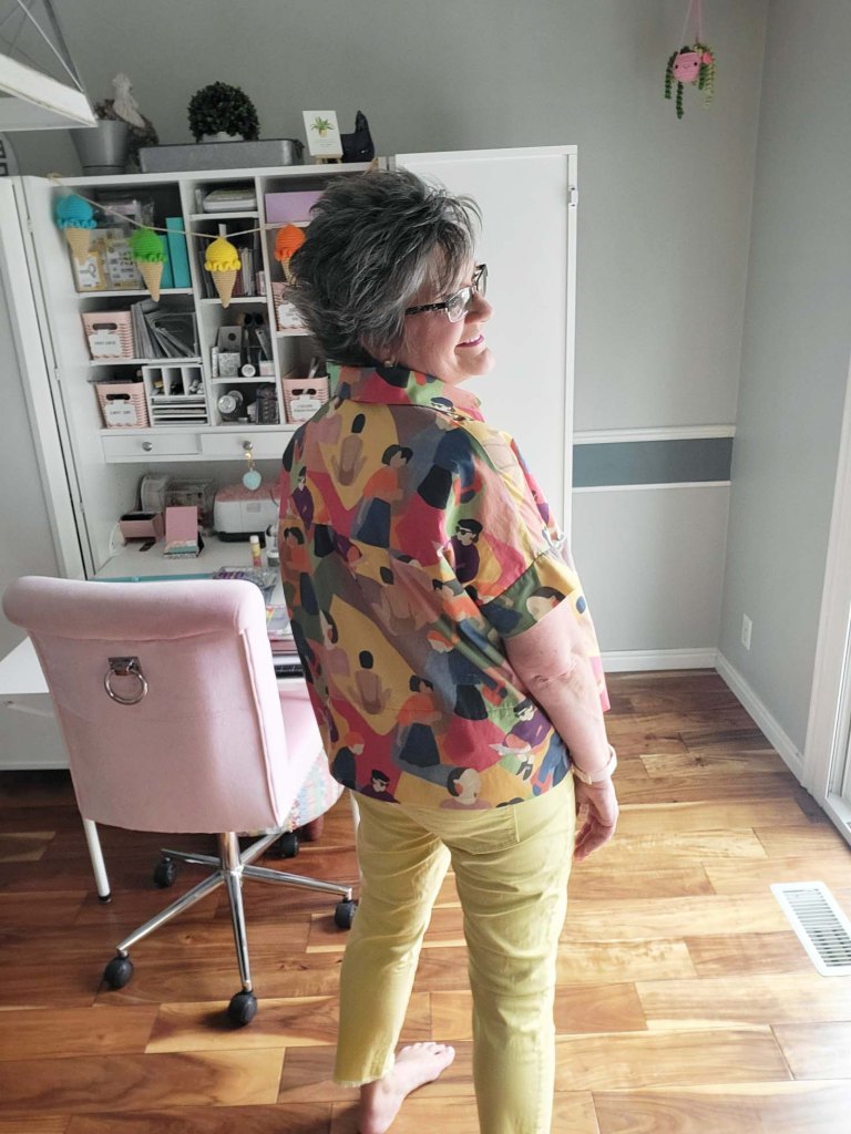 The seam down the front of the top allows for an easy way to add this keyhole with button and loop closure. The pattern instructions are clear and easy to follow. The pattern rating is for confident beginner, and I would say that is an accurate rating (just don’t use a plaid fabric). The pattern also guides you through terrific finishing techniques so you do not have any exposed edges on the inside of the garment.