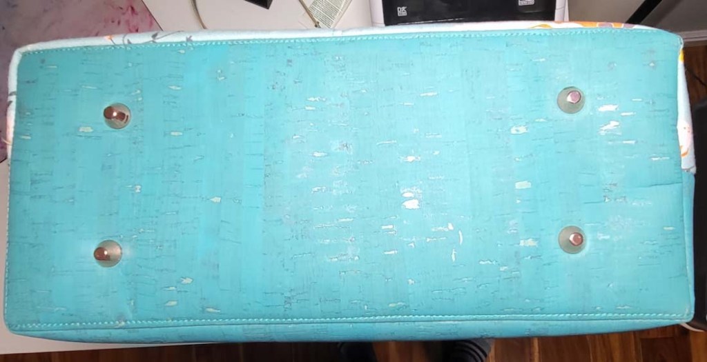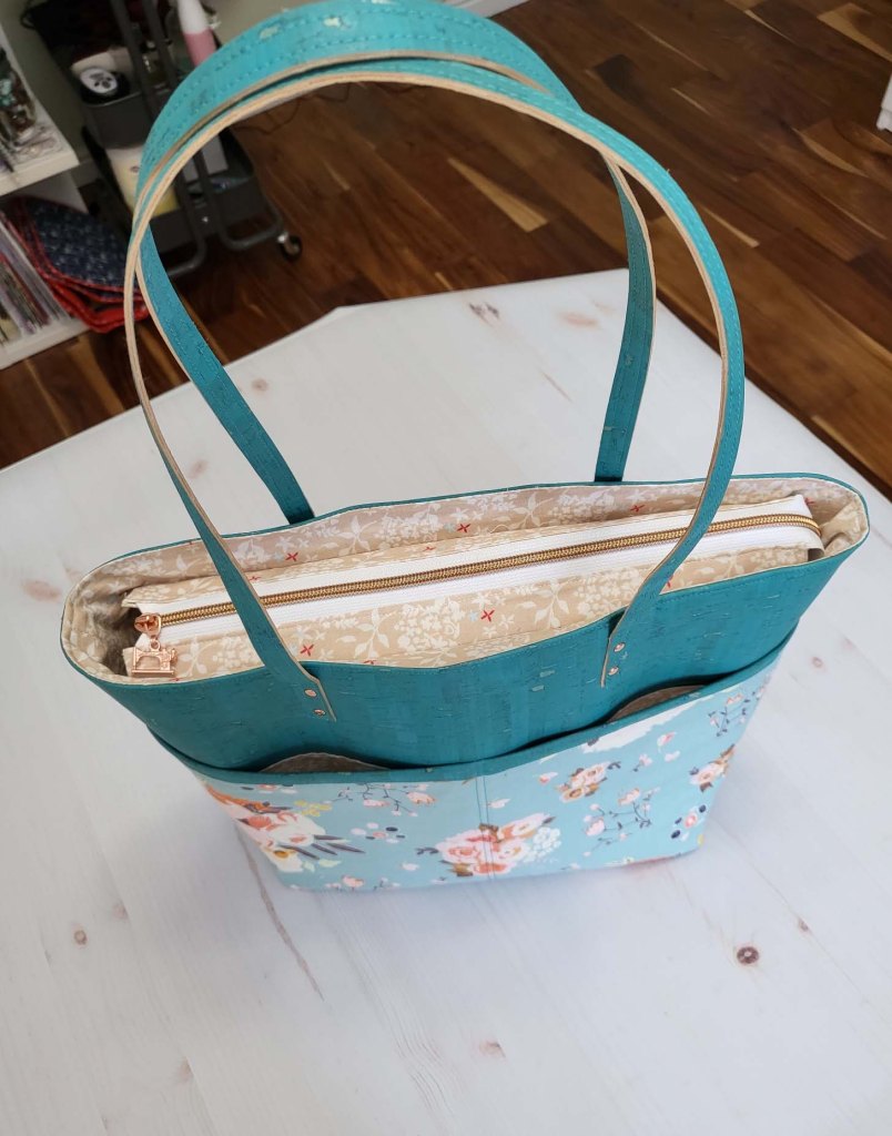 I used turquoise cork for my main fabric; quilting cotton from Minki Kim’s Hidden Cottage line for the outer pockets; and quilting cotton from Minki Kim’s Someday line for the lining. My Baby Lock Destiny II does not like to sew through cork, foam, and cotton, so I used my old Viking Mega Quilter to stitch my bag together.