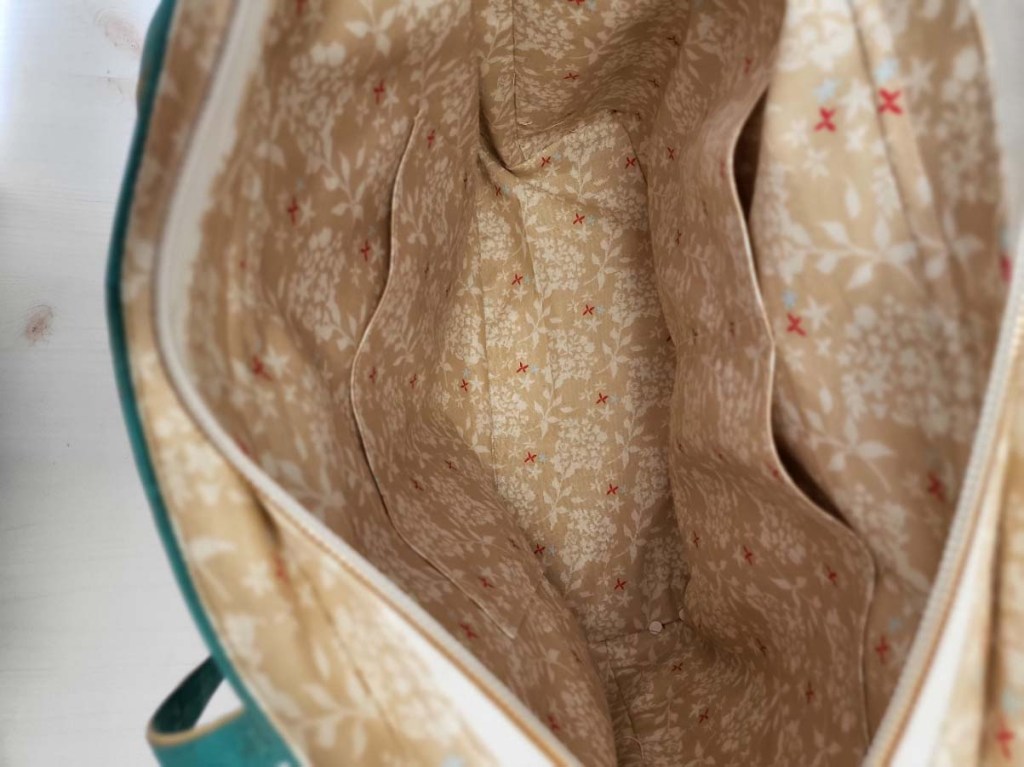 I sewed up the bag just as the instructions indicated with a single pocket on one side of the lining and a double pocket on the opposite side of the lining. One thing I would change in my next bag, is that I would add SF101 (or similar) interfacing to the inner pockets. The pattern does not call for interfacing on these pattern pieces (piece M and piece N), but I would highly recommend interfacing them. Without interfacing, the pockets are somewhat ‘floopy’.