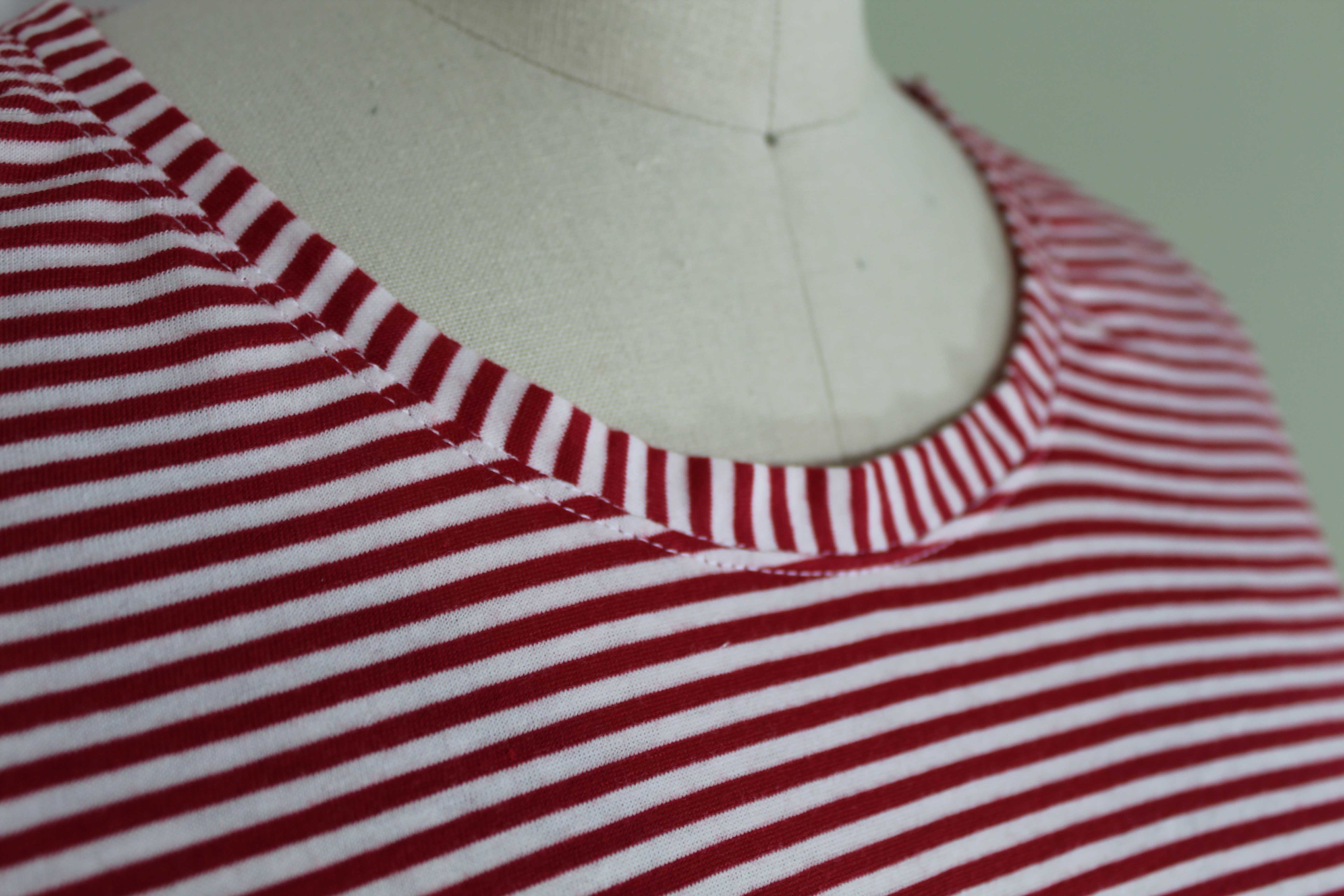 The neckband is attached in a continuous loop, then the “V” is made by sewing a small dart into the band. Here is a look at the inside of the neckband where that dart is sewn:
