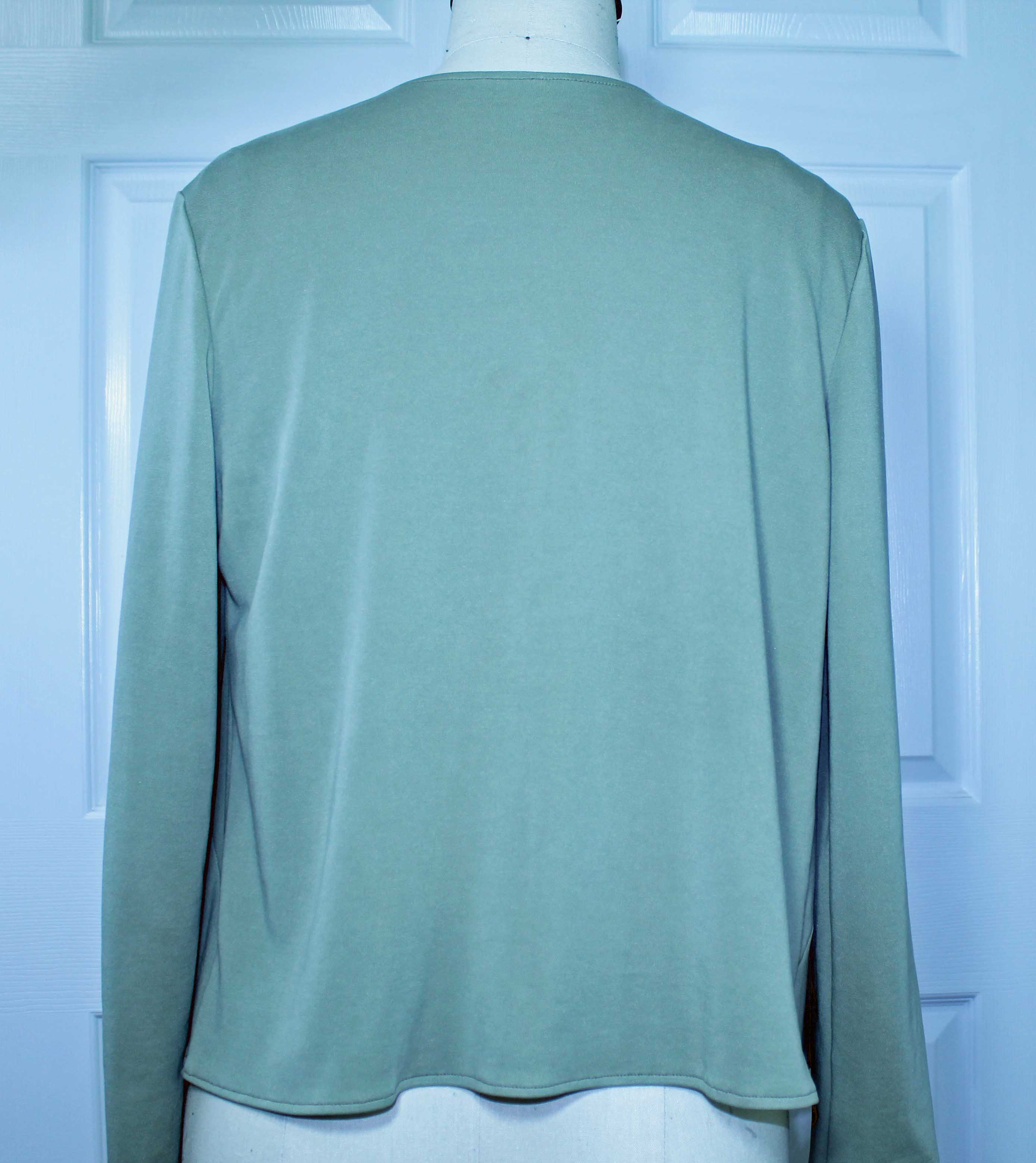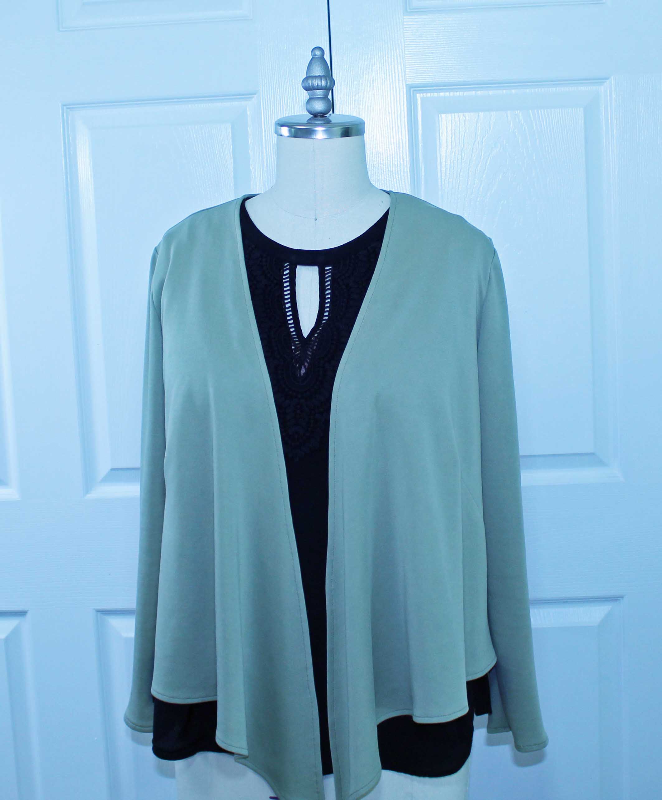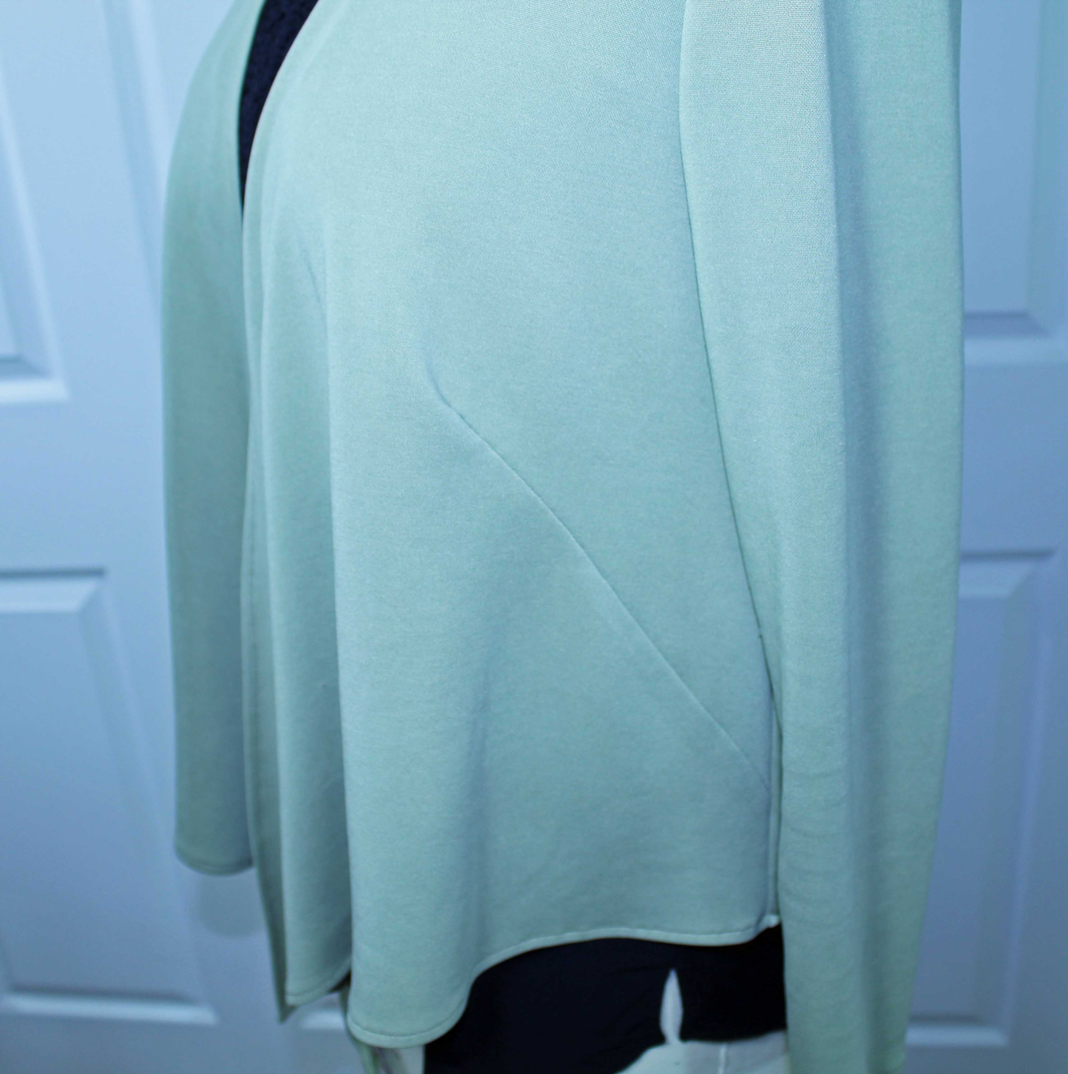 So I shifted gears, searched my stash, and pulled out a polyester knit with lots of beautiful drape. The green was not my first choice for my new cardy, but it is still a lovely garment. Here is a look at the back of it. It shows off the drape: